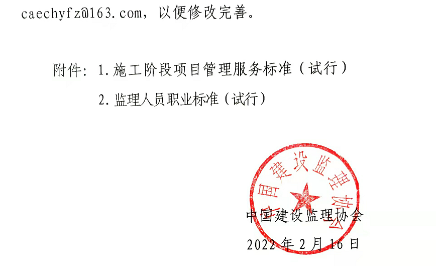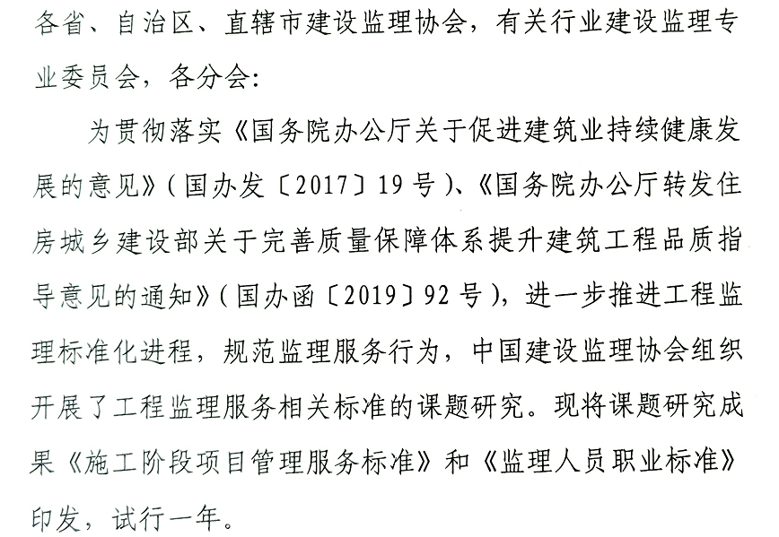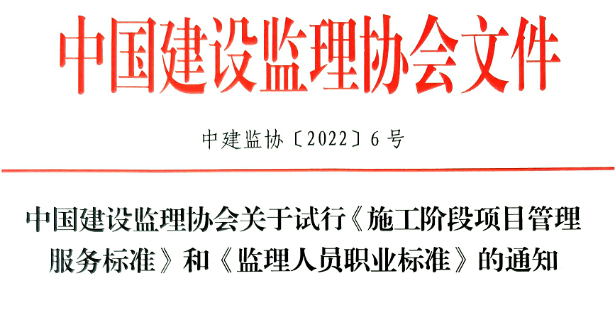 近日,中國建設監理協會官網印發試行《施工階段項目管理服務標準》和《監理人員職業標準》的通知。
