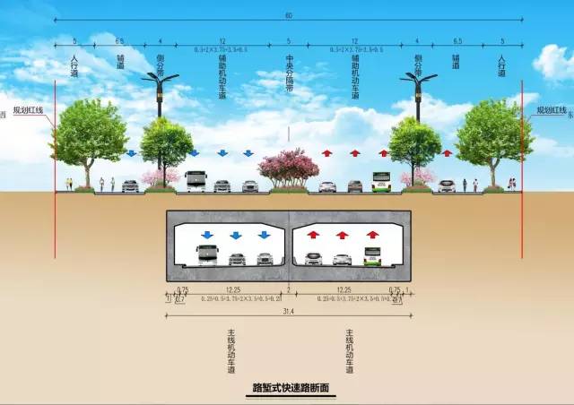 王城大道快速路北起連霍高速洛陽站出口,沿現狀路向南,與新310國道、機場路設置樞紐型互通立交,跨越規劃北環路后,以地道方式連續下穿老310國道、魏紫路、狀元紅路,與現狀漢宮路即瀍澗大道設全互通立交,繼續向南跨越隴海鐵路,進入洛陽城市核心區,與紗廠西路設樞紐型互通立交,之后向南以高架橋的方式穿越現狀洛陽城市核心區,與九都路設置樞紐型互通立交;繼續向南跨越洛河橋后,進入洛龍新區,與古城路設置樞紐型互通立交,下穿開源大道、牡丹大道后,上跨關林路、伊洛路,并與伊洛路設置互通立交,終點與南環李屯特大橋銜接。線路全長19km。