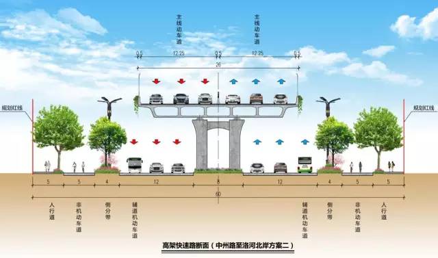 我公司中標為二標段:隴海鐵路橋橋南—王城大橋南,長5.12公里。高架主線為雙向6車道,設計時速為80km/h,地面為雙向6車道,設計時速為60km/h。標段內含王城大道與紗廠西路互通式立交,沿紗廠西路和解放路向洛陽火車站方向設置高架橋;王城大道與九都路菱形互通式立交,其中九都路下穿王城大道隧道;局部設置簡易式上下匝道橋。